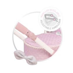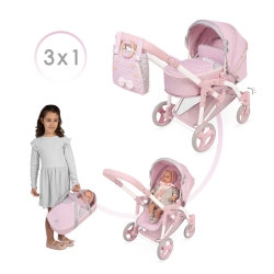 Incluye: 1 carro de muñecas 3 en 1 de la linea Sophie de color rosa con detalles blancos y grises convertible en silla de paseo o portabebés con estructura plegable, manillar con altura ajustable, ruedas delanteras giratorias, tela acolchada, lazos acolchados, detalles bordados, botones decorativos en madera natural, ruedas con cubierta de foam, cubre con pequeño bolsillo, bolso a juego con asas de madera natural, bandeja portaobjetos de tela a juego.