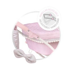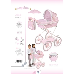 Incluye: 1 carro de muñecas de la linea Sophie de color rosa con detalles blancos y grises, estructura plegable, manillar con altura ajustable, suspensión, tela acolchada, lazos acolchados, detalles bordados, botones decorativos en madera natural, capota con tensores, grandes ruedas con cubierta de foam, cubre con pequeño bolsillo, bolso a juego con asas de madera natural, bandeja portaobjetos de plástico forrada con tela a juego.
