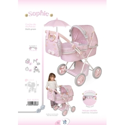 Incluye: 1 carro de muñecas de la linea Sophie de color rosa con detalles blancos y grises, estructura plegable, tela acolchada, lazos acolchados, detalles bordados, botones decorativos en madera natural, bolso a juego con asas de madera natural, sombrilla, bandeja portaobjetos de tela, capazo con pequeño bolsillo, ruedas con cubierta de foam y muchos más detalles de lujo.